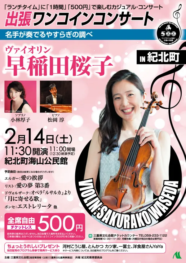 出張ワンコインコンサート IN 紀北 ヴァイオリン 早稲田桜子|イベント詳細|文化会館|三重県総合文化センター